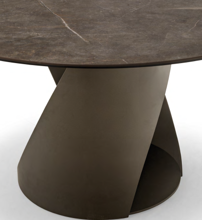 Caratterizzato da un basamento centrale in acciaio curvato ispirato al movimento ciclonico, il tavolo CYCLONE affascina per il suo design dinamico e scultoreo. Il piano rotondo in ceramica effetto marmo, anche allungabile, unisce eleganza e funzionalità in un equilibrio perfetto di forme e materiali.