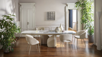 Disponibile anche nella versione Wood, con gambe in legno, mantiene lo stesso design armonioso e accogliente perfetto per la zona pranzo.